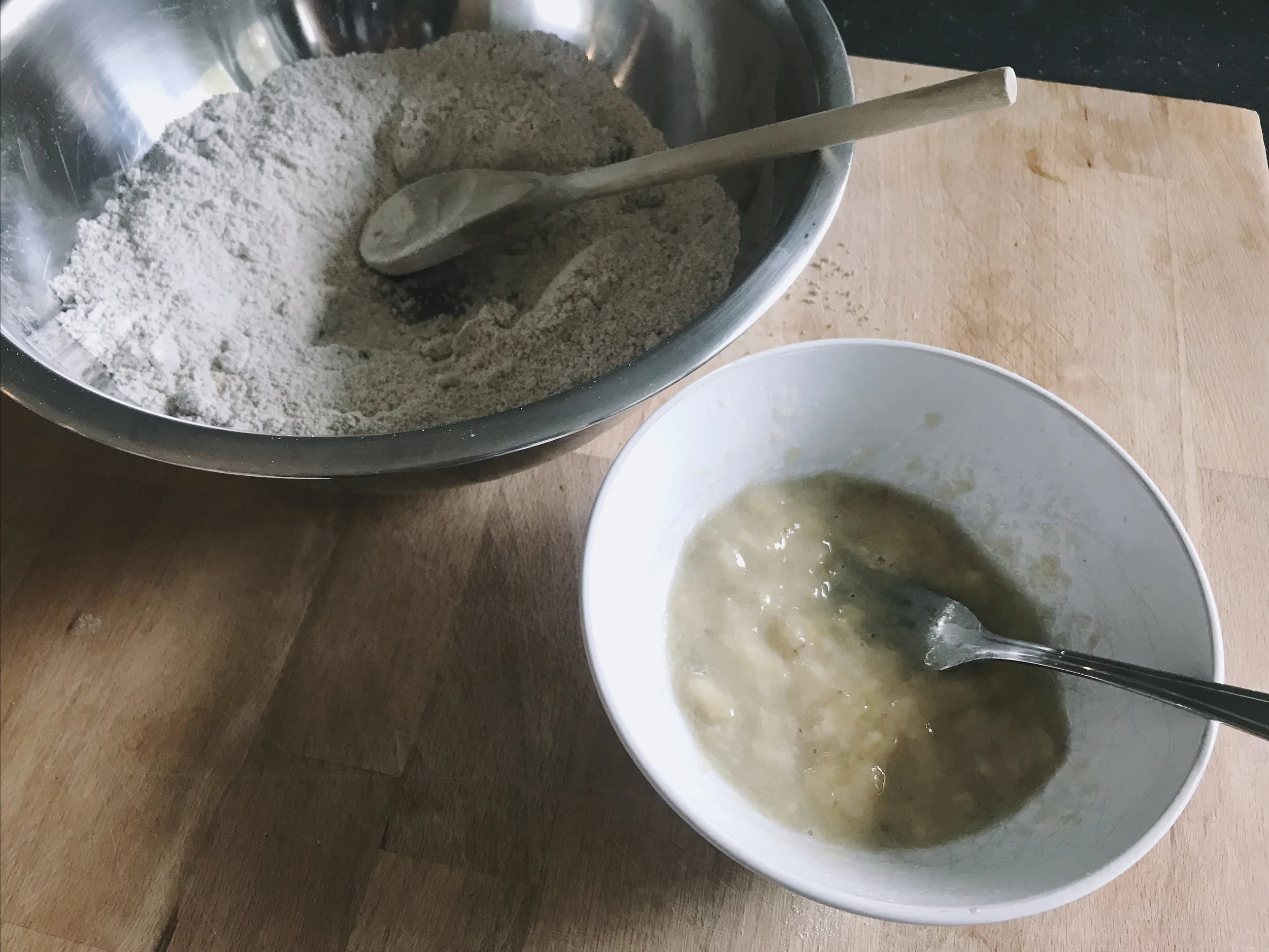 4. Écraser la banane et déposer dans le bol. Mélanger du mieux possible avec la farine.