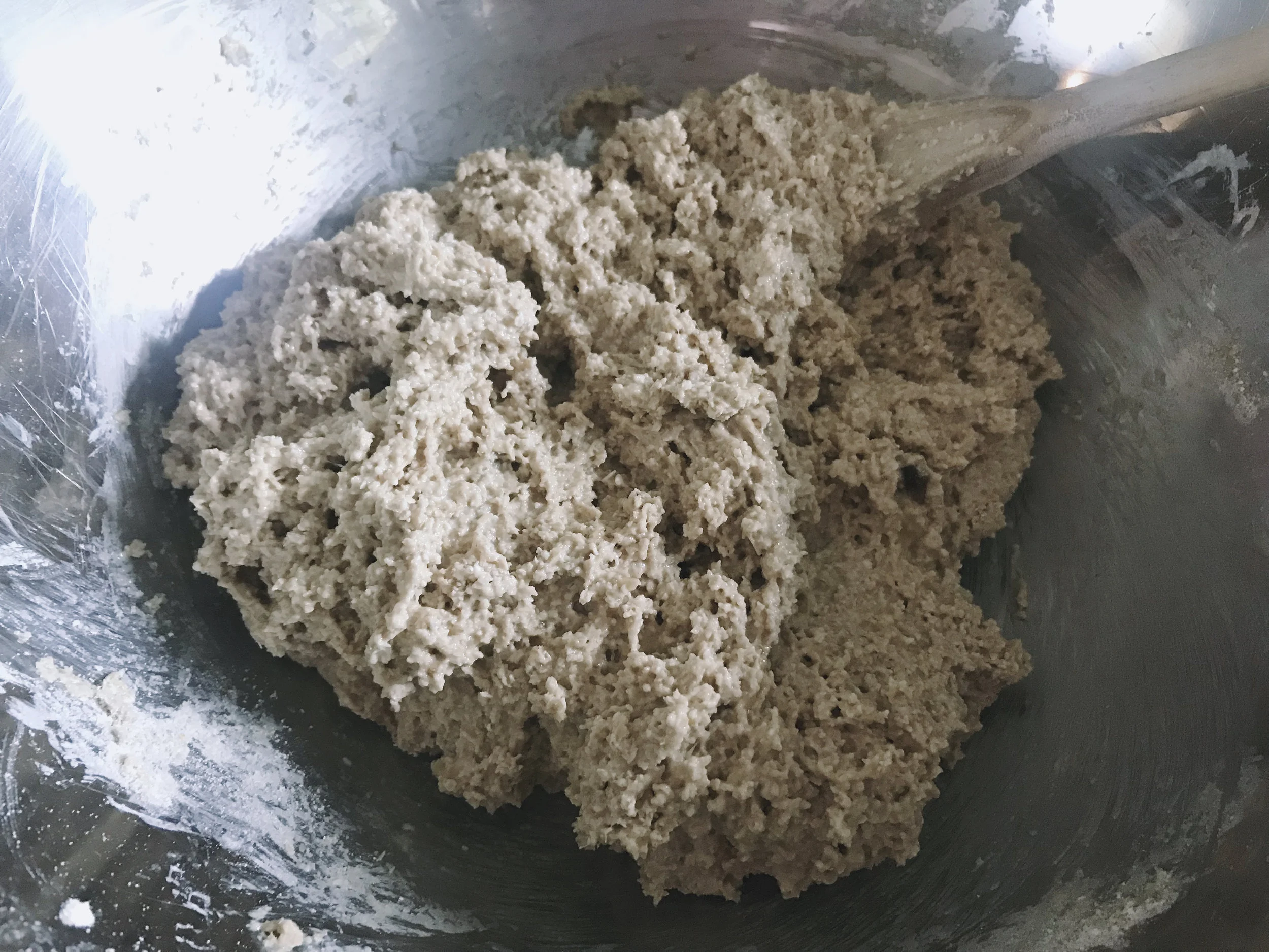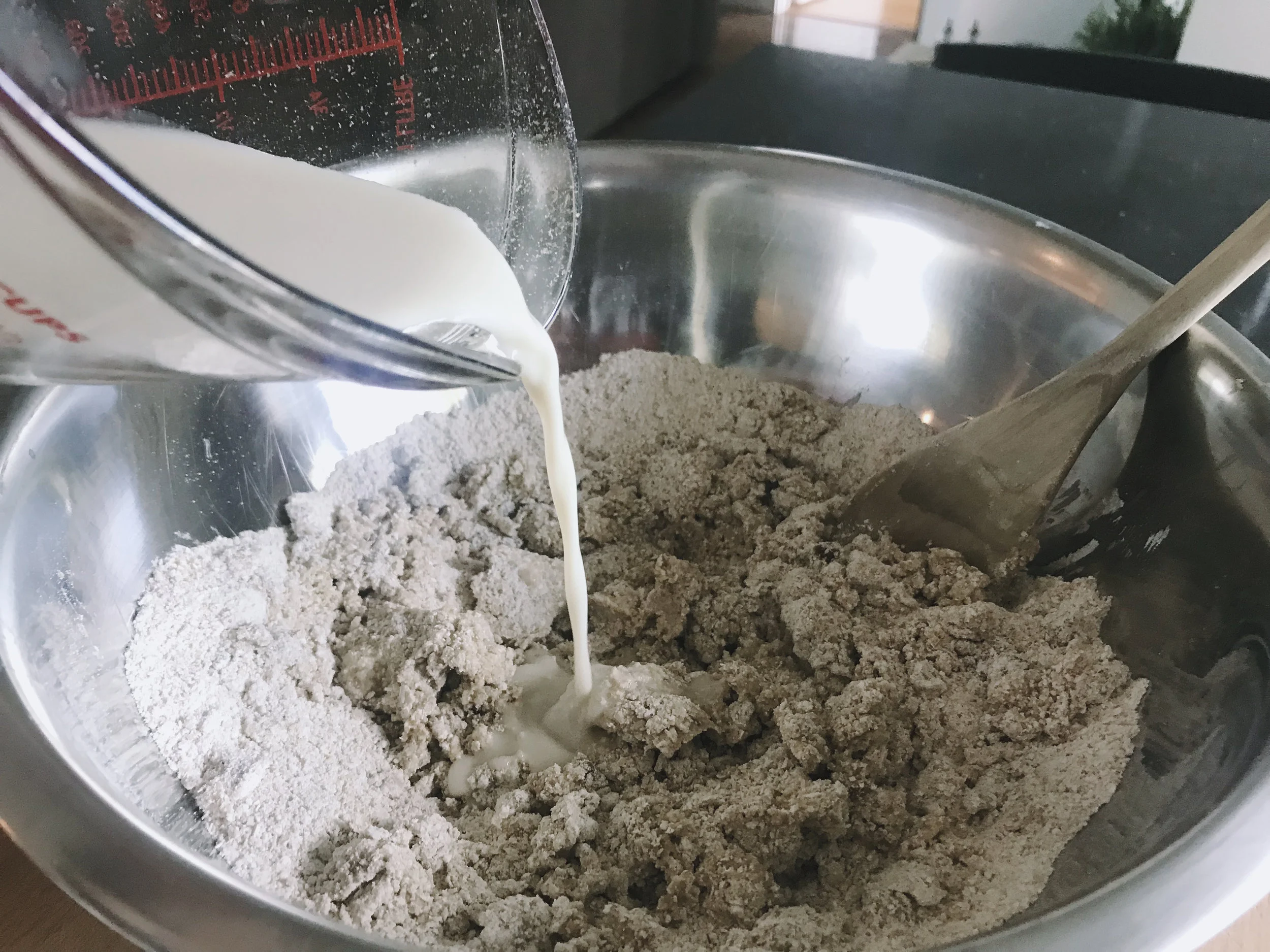 5. Verser le lait végétal et mélanger jusqu’à obtention d’une pâte consistante.