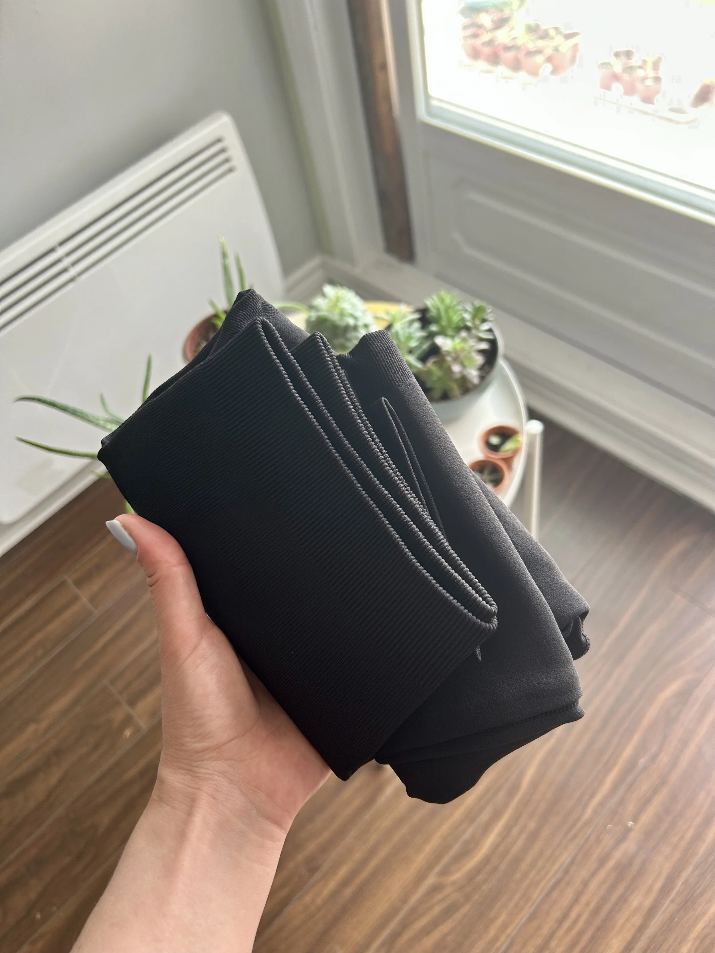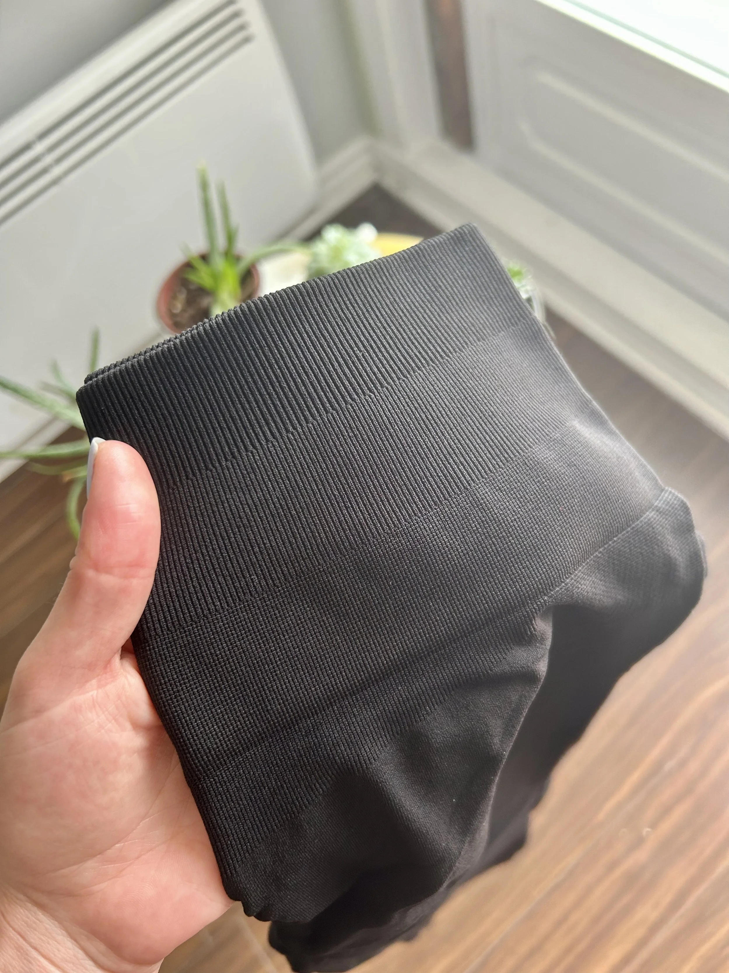 Le tissu est épais, relativement doux, mais super extensible! Je les trouvais petits en les sortant du sac, mais ils me font bien puisqu’ils sont super extensibles. J’aime bien la section élastique à la taille.